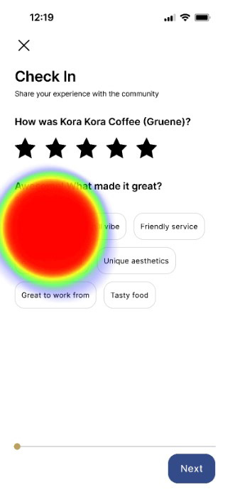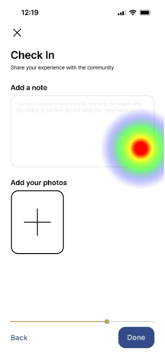 The next test asked users to go through the “check in” flow. I specifically instructed testers to check in, give the shop a 5 star rating for their “great drinks” and “chill vibe.” They were also to report having a cappuccino, add a note, and upload photos to complete their check in. All of the steps went well except one in particular.