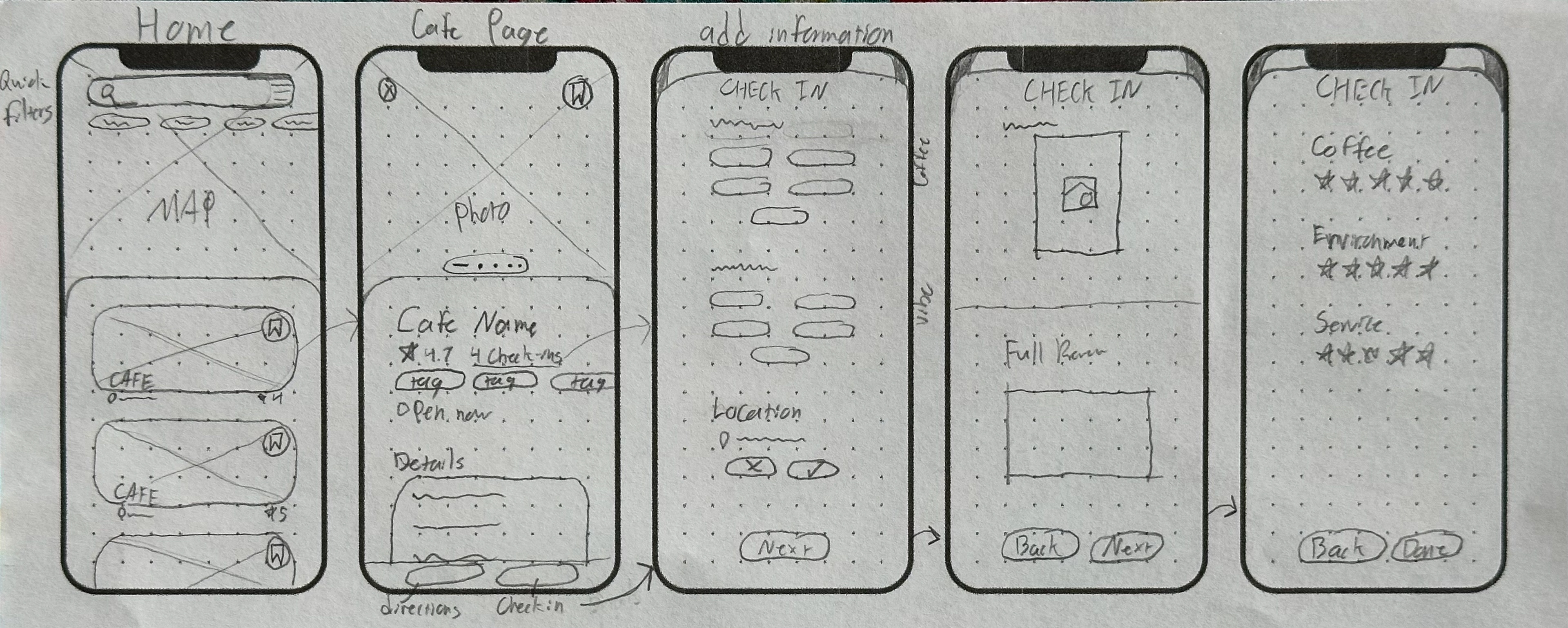 My sketches were based on the pages in the Information Architecture and User Flow in the define stage. The top screens that needed to be well thought out were the home/map page, the cafe card, and the check in.