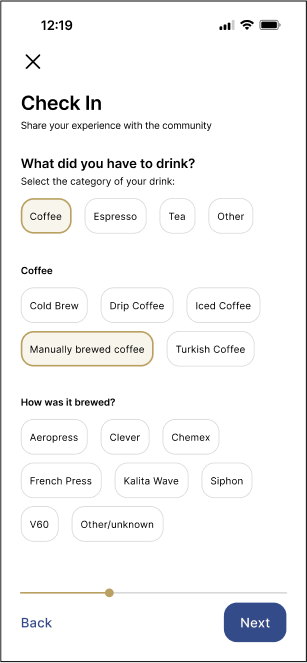 This provided an opportunity to not only bring clarity to the check in process, but also narrow the focus of the app to coffee by removing the “tea” and “other” categories. Without those two superfluous options, I was able to present the Coffee and Espresso options on one screen. Since the drink categories are exclusive, that also allowed for any follow up questions.